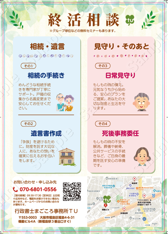 チラシのポスティングを行っています。 2025.10.07 お知らせチラシ18000枚を、福島区とその周辺に順次配布しています。(全戸配布ではありません。)配布期間は10月中です。 Post Share Hatena Pocket RSS feedly Pin it 日本認知症資産相談士協会(JDAC)北大阪支部研修会に参加しました。 前の記事 日本認知症資産相談士協会(JDAC)阪神支部研修会に参加しました。 次の記事